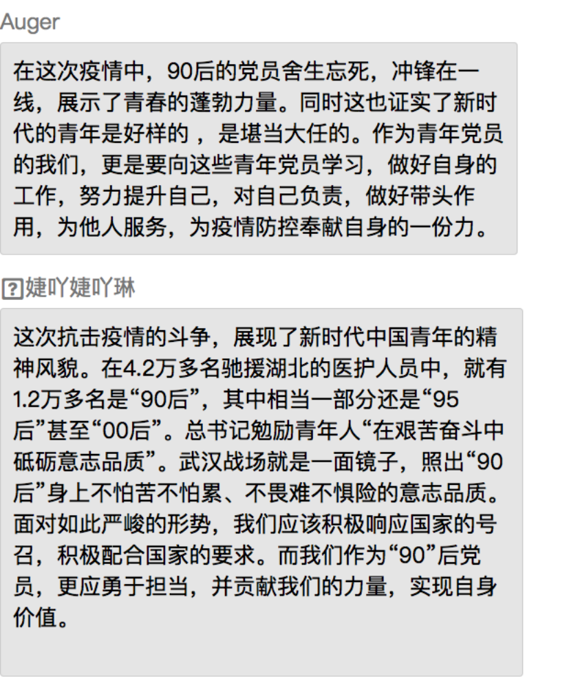 同学们表示,在党中央的坚强领导下,全国上下齐心协力共抗疫情,充分展现了中国特色社会主义制度的强大生命力和显著优越性,再一次见证了气势磅礴的中国力量、万众一心的中国精神和卓有成效的中国速率。作为新时代的中国青年,要勇做走在时代前列的奋进者、开拓者、奉献者,并积极配合政府、公司和社区,为打赢疫情防控阻击战贡献自己的力量。