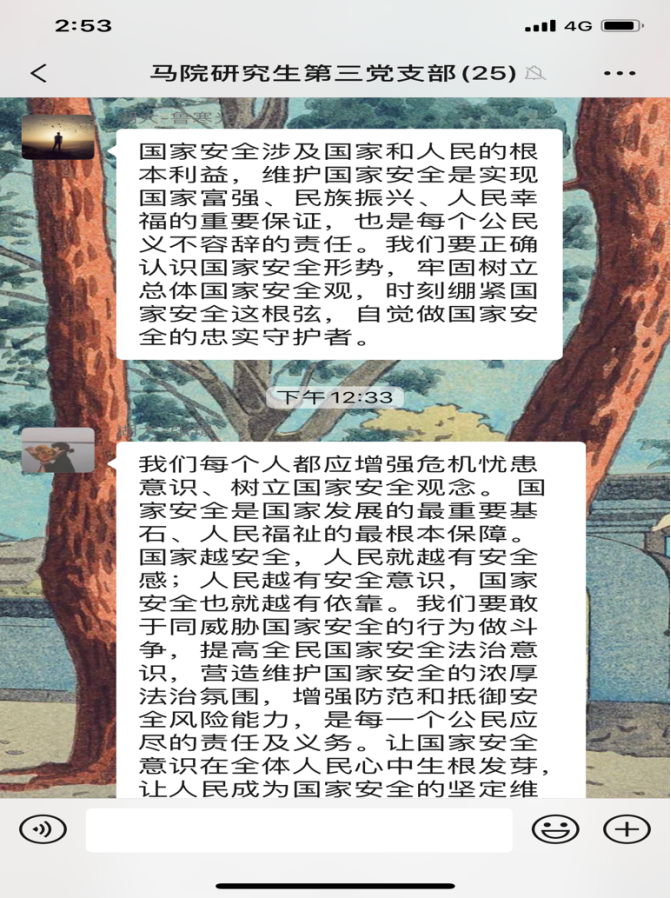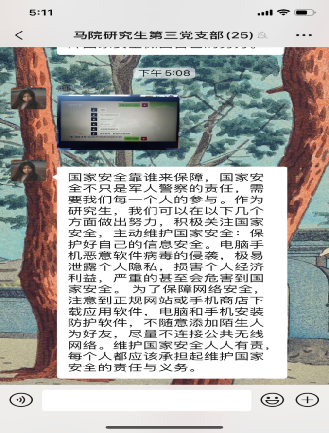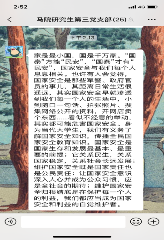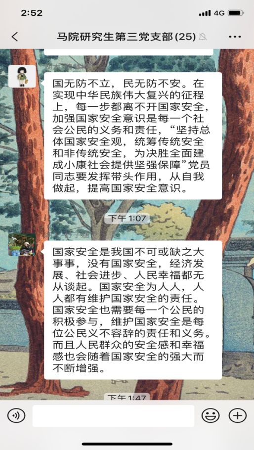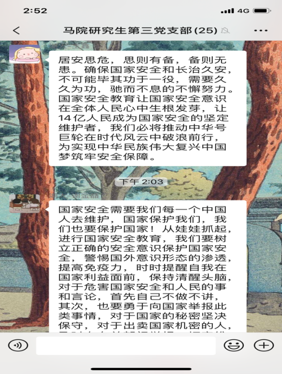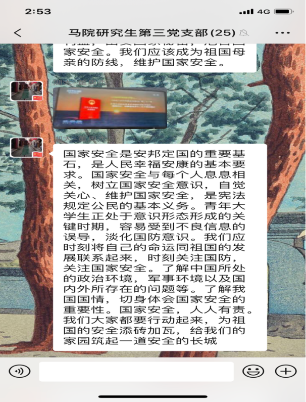 4月15日是第5个全民国家安全教育日,今年的活动主题是“坚持总体国家安全观,统筹传统安全和非传统安全,为决胜全面建成小康社会提供坚强保障”。为更好地开展国家安全教育,4月16日,太阳成集团tyc33455cc官网研究生第三党支部开展4月份主题党日活动,全体党员同志观看《汇聚人民力量 维护国家安全》专题片。在观看后,同志们感触颇多,纷纷在支部微信群分享观后感。