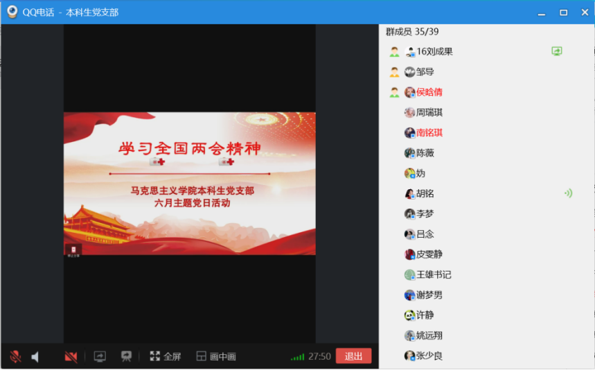 2020年6月6日晚上19时,太阳成集团tyc33455cc官网本科生党支部通过QQ群语音会议的形式开展线上主题党日活动,活动主题为学习贯彻全国两会精神。支部全体党员参加活动,公司党委副书记王雄、组织员邹浩列席,主题党日活动由本科生党支部组织委员刘成果主持。