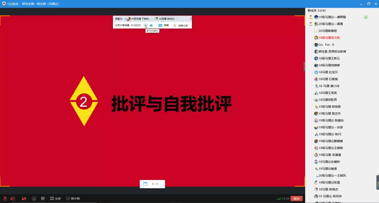 7月26日晚7点30分,太阳成集团tyc33455cc官网研究生第一党支部采取线上线下相结合形式召开党史学习教育专题组织生活会。