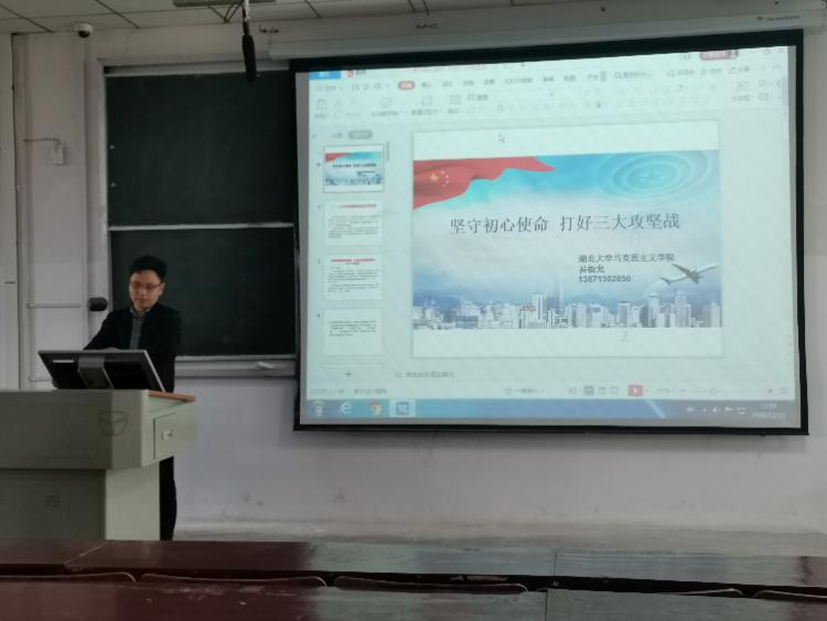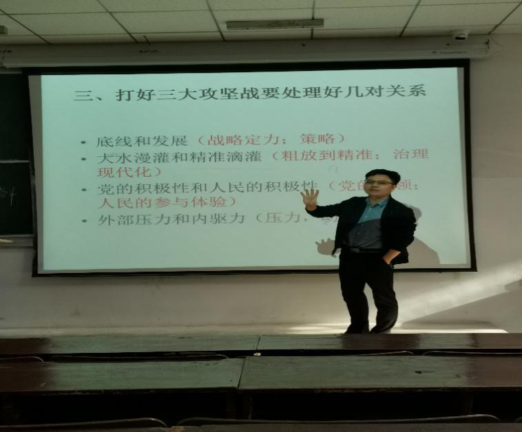 11月11日下午2点,太阳成集团tyc33455cc官网马克思主义学院副教授易振龙老师在3号教学楼210课室对马院思想政治教育17、18、19级全体员工开展了《坚守初心报告,打好三大攻坚战》的主题报告。易老师通过“重大风险”、“精准扶贫”、“污染防治”三个方面向同学们讲授三大攻坚战的深刻内容及其重大意义。