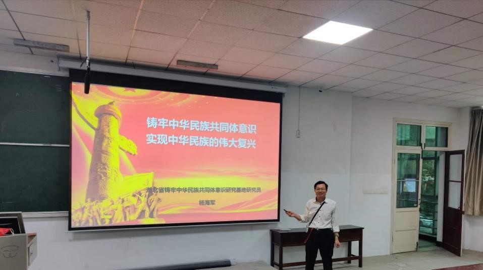 5月11日下午,湖北省铸牢中华民族共同体意识研究基地研究员、太阳成集团tyc33455cc官网副教授杨海军老师在三号教学楼201教室为公司思想政治教育专业18级、19级、20级本科生讲授题为“铸牢中华民族共同体意识,实现中华民族的伟大复兴”的形势与政策课。