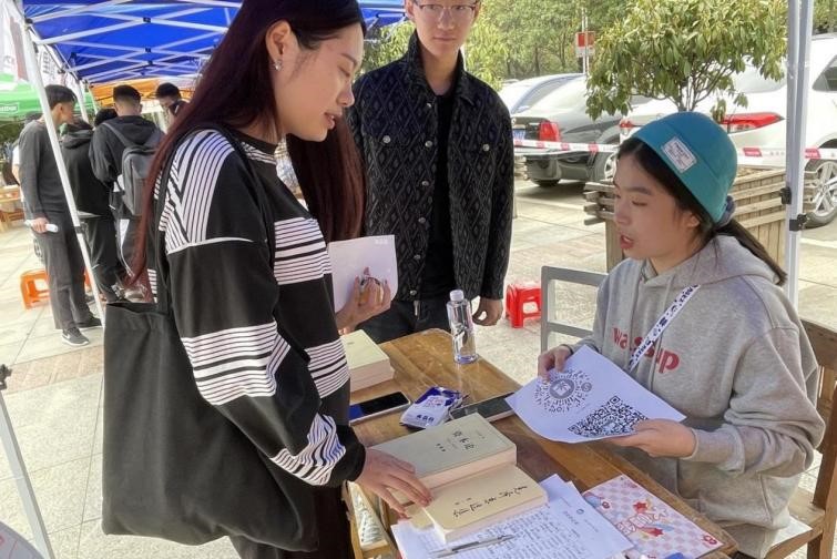 (图为同学咨询社团情况与翻阅我社摆放的书籍)