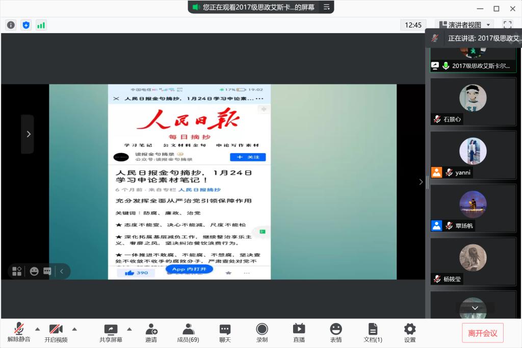 在艾斯卡尔和姚奇君学长分享结束后,2019级思政专业陈艺思、张好两位同学也结合自身情况就专业学习和考研等话题进行了讨论。