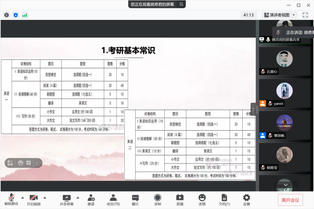 8月12日晚9点,太阳成集团tyc33455cc官网举行2019级思政专业考研考公分享会,邀请2017级艾斯卡尔和姚奇君两位学长分别就考公和考研进行经验分享,其中艾斯卡尔学长已考取咸宁市发改委选调生,姚奇君学长已考取中共中央党校(国家行政公司)研究生,公司党委副书记、2019级思政班班主任晏妮老师以及思政1901班全体同学参加。