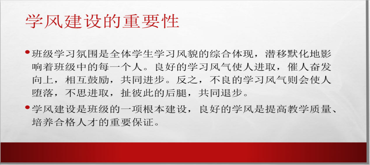 在会上,班主任强调了班级学习建设的重要性。学风建设是班级的一项根本建设,良好的学风是提高教学质量、培养合格人才的重要保证。