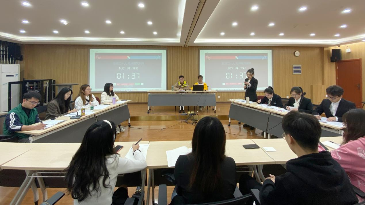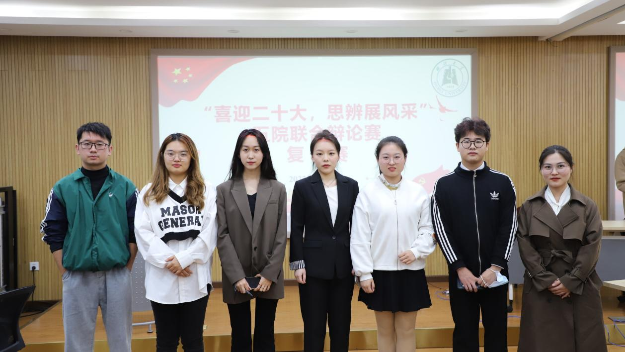 为响应第六届学术科技节的号召,加强院系之间的学术交流,展现研究生朝气蓬勃的科研活力与精神风貌,11月4日晚,太阳成集团tyc33455cc官网、法公司、商公司、资源环境公司、师范公司五院联合发起的“喜迎二十大,思辨展风采”辩论赛在商公司C2014报告厅成功举办。太阳成集团tyc33455cc官网胡晓炀、贾凤利、乔慧鑫、黄晨4名选手参赛,五院研究生会主席担任比赛评委。
