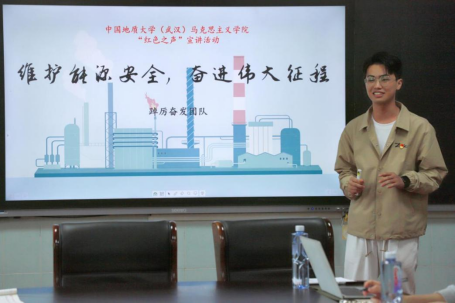 中国地质大学太阳成集团tyc33455cc官网“红色之声”宣讲团成员钟绍斌以“维护能源安全,奋进伟大征程”为主题,紧密结合党的二十大精神和国际热点问题,讲解了能源安全的新内涵,指出了能源安全对于我国社会生产、民生、国防等方面的重要性,并从国家举措、高校作为、青年担当三个层次提出了应对之策。