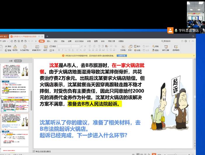 5月16日16:30,2021级学科教学(思政)李远主讲高中选择性必修2 《法律与生活》第四单元第十课第二框《严格遵守诉讼程序》。课堂中设置了模拟法庭这一教学环节,生动有趣,过程中员工们都积极参与,员工既可以知道诉讼的基本程序,同时感受到了模拟法庭带来的快乐,甚至为以后职业的选择提供一些建议,课堂反映良好。