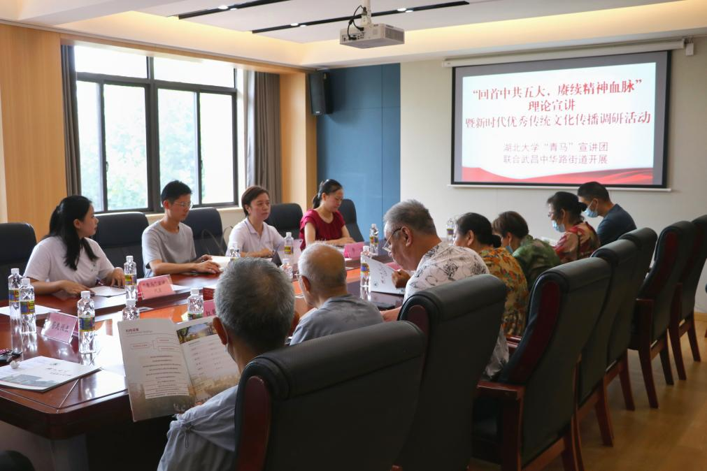 (通讯员刘卓凌)为充分发挥高校社会职能,进一步服务地方社会发展,7月14日上午,公司党委副书记晏妮、辅导员冷自衍及公司“青马”宣讲团6位成员赴中华路街道都府堤社区交流座谈。中华路街道办党建办公室科长李洁,户部巷、楚才、西城壕、都府堤四个社区相关负责人、“红巷爷爷”代表、都府堤社区居民代表、公司22级学科教学(思政)研究生徐家庆参与此次活动。