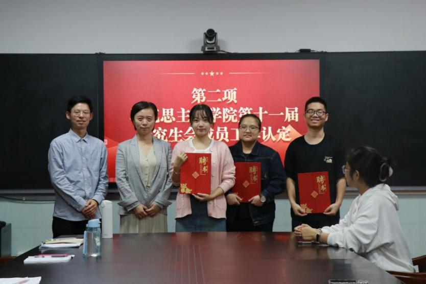 随后,马克思主义公司党委副书记晏妮老师、研究生辅导员冷自衍为第十一届研会成员颁发工作认定并合影留念。