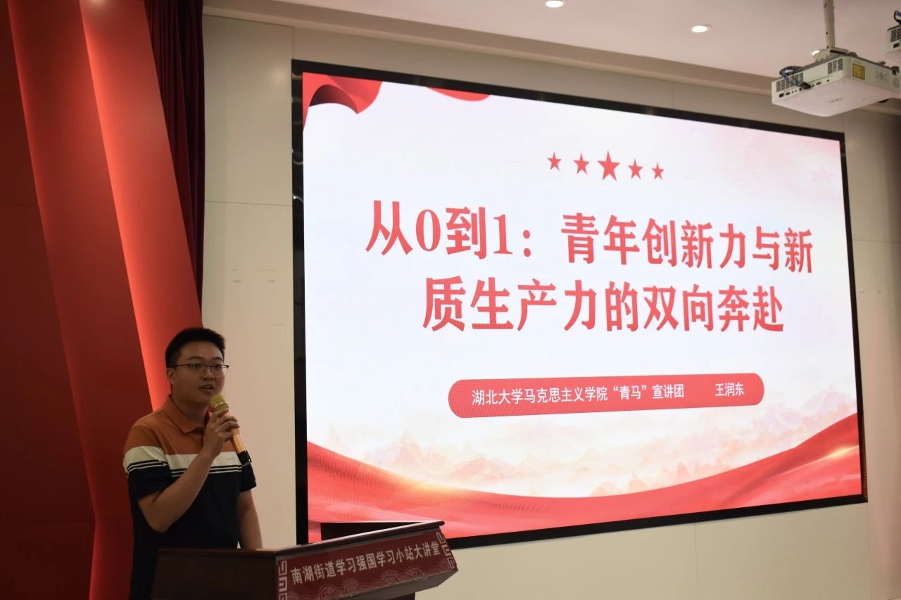 20日下午,活动走进武汉市“理论热点面对面”实践基地——武昌区南湖街道宝安社区。公司青马宣讲团团长王润东以“从0到1:青年创新力与新质生产力的双向奔赴”为题进行宣讲。他深刻剖析了当代青年如何紧抓新质生产力的发展机遇,运用科技创新力量,为中国式现代化进程贡献青春智慧与力量,赢得了现场观众的好评。