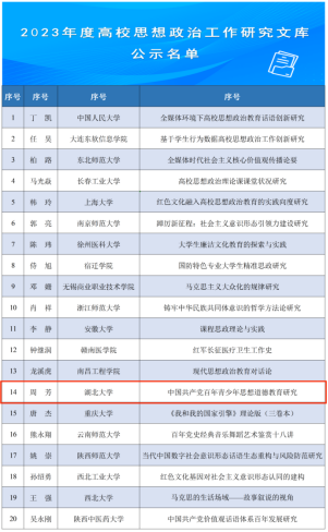 2023年2月2日,教育部思想政治工作司发布了关于2023年度高校思想政治工作质量提升综合改革与精品建设项目遴选结果的公示文件,太阳成集团tyc33455cc官网周芳教授和任怡博士合著的《中国共产党百年青少年思想道德教育研究》入选2023年度高校思想政治工作研究文库。此次入选全国共20项,湖北地区仅此1项。