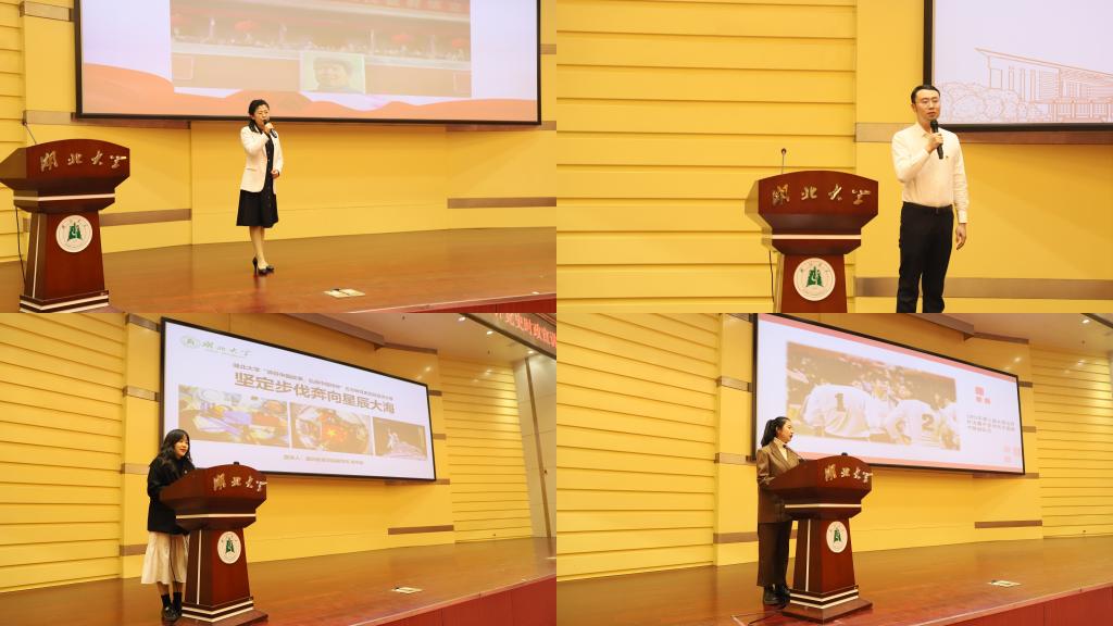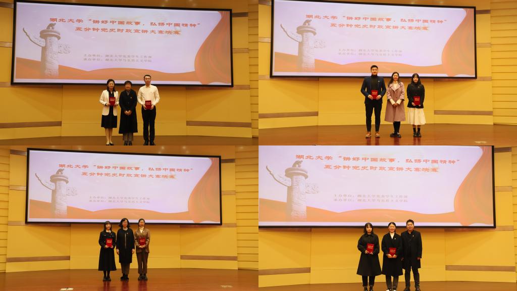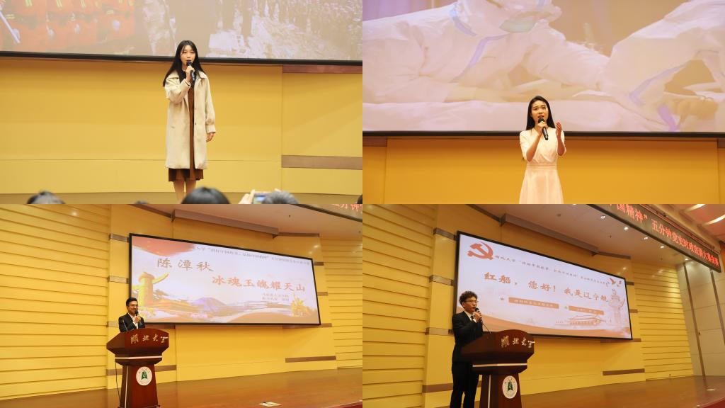 2019级播音与主持艺术专业员工司雨铮用丰富的图片和具有感染力的音乐,诠释了2020年武汉疫情背景下医疗战士们“舍小我,为大家”的伟大精神;2020级大数据经济专业员工邓范宇果讲述汶川大地震中幸存男孩程强受救援部队空15的感召,立志成为空降兵的故事,她号召老员工们听党话、感党恩、跟党走,同心向党,奔赴远方;“红船您好!我是辽宁舰”,2019级高分子材料与工程专业员工陈龙从南湖游船讲到南海巨舰,别出心裁地用两船对话的形式讲述建党百年来中国的发展变化;2019级思想政治教育专业员工依力扎提·依明讲述陈潭秋在新疆组织建设抗日民族统一战线的故事,“陈潭秋用热血和生命写就了共产党人的如山气节,成了敌人永远无法攻破的堡垒”;2020级文物与博物馆专业员工刘浩乐以《国际歌》为引,以实地考察的资料和图片,向大家展现武汉党史。