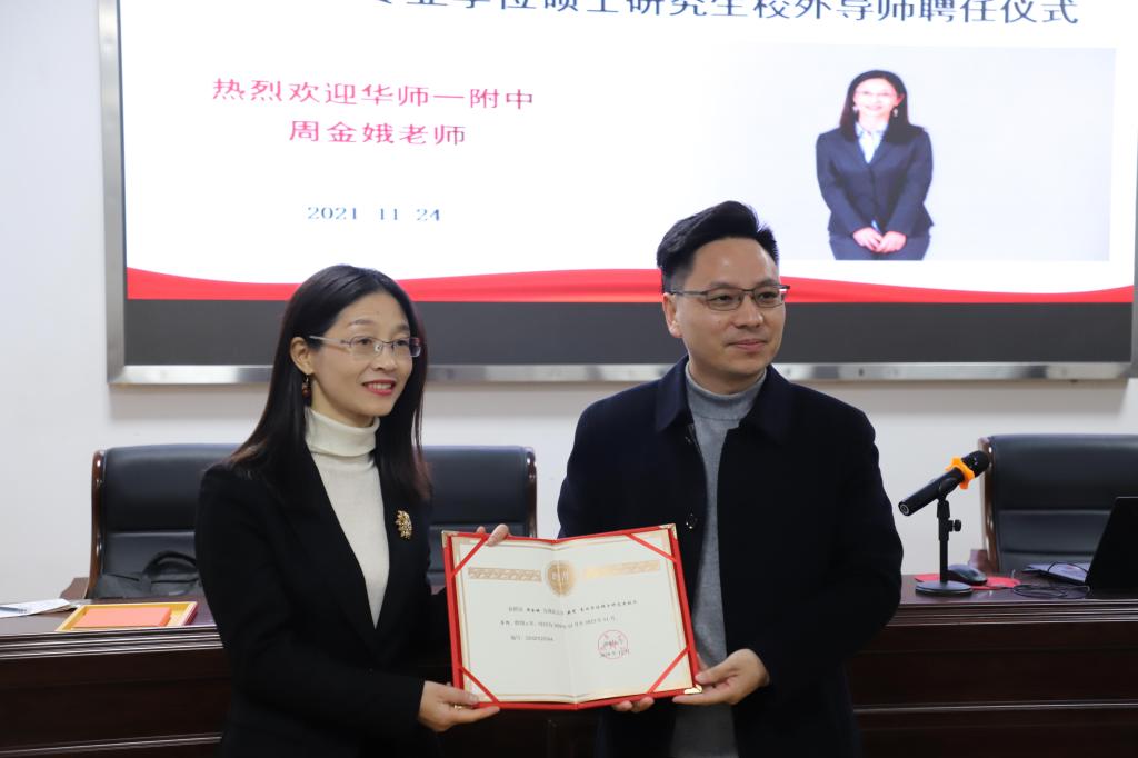 易振龙副经理为周金娥老师颁发公司硕士专业学位校外导师聘任证书,并对周老师来院讲座表示热烈欢迎。
