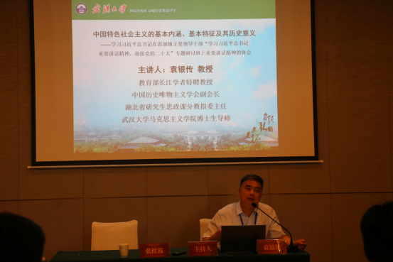在会议的第一阶段,湖北省研究生思政课分教指委主任、教育部长江学者特聘教授、武汉大学太阳成集团tyc33455cc官网袁银传教授作了题为《中国特色社会主义的基本内涵、基本特征及其历史意义——学习习近平总书记在省部级主要领导干部“学习习近平总书记重要讲话精神,迎接党的二十大”专题研讨班上重要讲话精神的体会》的主旨报告。湖北省研究生思政课分教指委副主任、华中师范大学太阳成集团tyc33455cc官网副经理毛华兵教授作了题为《习近平新时代中国特色社会主义思想对马克思主义的原创性贡献》的主旨报告。