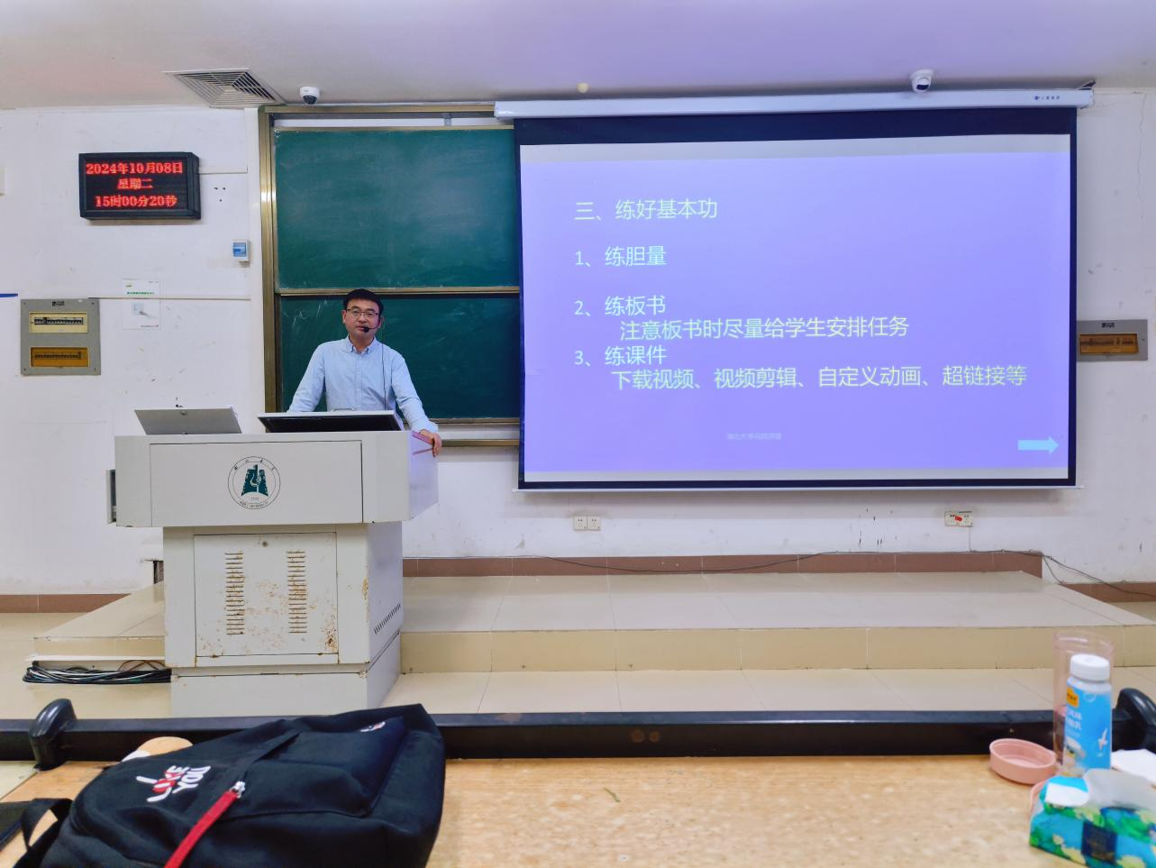 周爱民老师强调了练好胆量、板书、课件三项教师基本功的重要性,并分享了在板书时给员工安排任务,合理设置课件超链接等实践措施。周爱民老师还提出,同学们要多做大型考试题目分析考点变化,将教材知识点先按重要程度分类,而后有选择性地授课;并提醒同学们开展议题式教学时,要重视员工的自主性,提高教学效果。