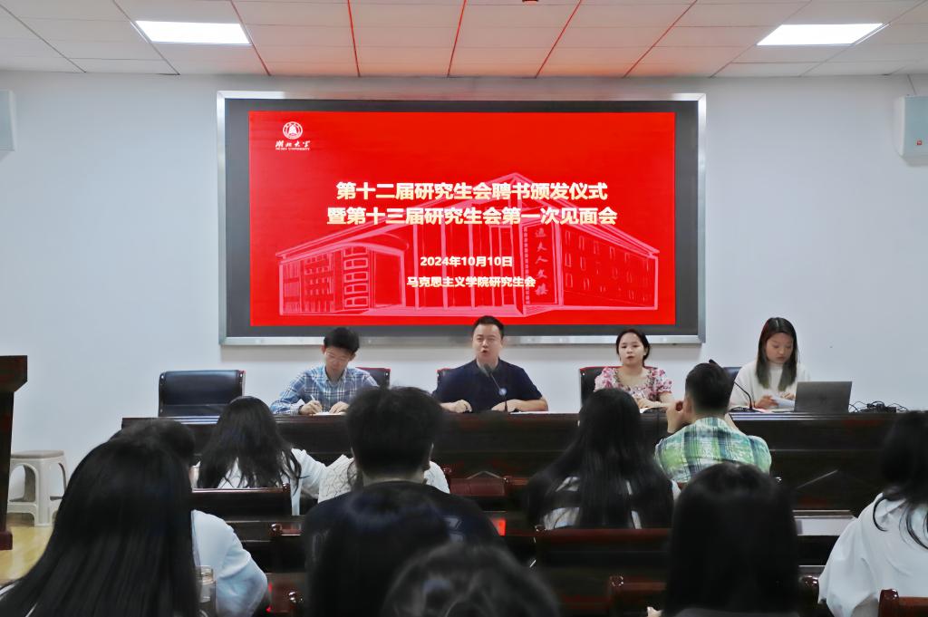 10月10日下午,太阳成集团tyc33455cc官网第十二届研究生会聘书颁发仪式暨第十三届研究生会见面会在公司410报告厅举行。公司党委副书记周杰、辅导员冷自衍、兼职辅导员周珍、第十二届研究生会主席团和第十三届研究生会全体成员出席会议。会议由第十三届研究生会主席杨昕怡主持。